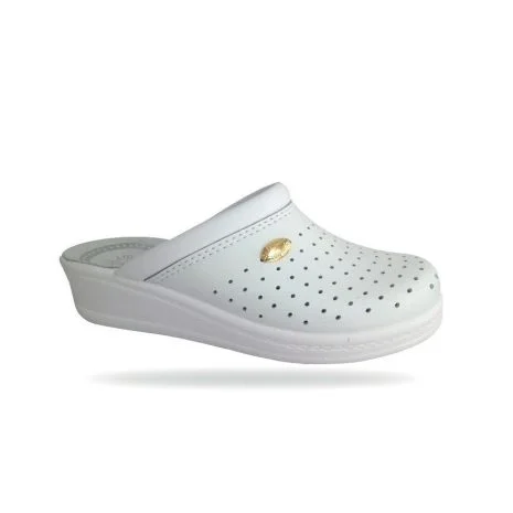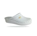 Jól szellőző bőr felsőrésszel készült, kényelmes zárt papucs, puha talpággyal, könnyen tisztítható talpbéléssel, enyhe haránt alátámasztással. Kényelmes, komfortos viselet.