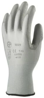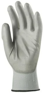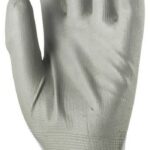 A kesztyű rugalmas, kötött és kifejezetten nagy szakítószilárdságú 100% poliészter szálat tartalmaz. A tenyéren poliuretánnal mártott, a kézhát pedig szellőző. Precíziós kesztyű, amely gumírozott mandzsettával rendelkezik. Finom, 13-as kötésű, szürke színű mártott kesztyű.