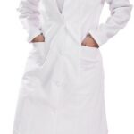 Fehér színű textil köpeny, 230 g/m² vastag, kiválóan szellőző, testbarát 100% pamut alapanyag, mely 90°C-on is mosható. 4/4-es (120 cm) galléros, egyenes szabású, gombos „orvosi” köpeny három zsebbel.