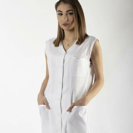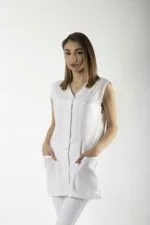 Kevert szálas tunika , egészségügyi-, óvodai-, bölcsődei-, élelmiszeripari dolgozók közkedvelt terméke. Nyakánál V kivágással ellátva. Ujjatlan fazon, karöltőn, zsebeknél szatén csíkokkal díszítve. 3 zsebes változat.  Teljesen műszálas társaikhoz képest puhább, lágyabb esésű anyaggal rendelkezik, így sok esetben aláöltözetet nem feltétlenül igényel.  Széles méretskálával rendelkezik 42-es mérettől egészen 66-ig elérhető. Anyagösszetétel 65% PE és 35% viszkóz, ez együttesen 170g/m2 sűrűségű anyagot eredményezett.