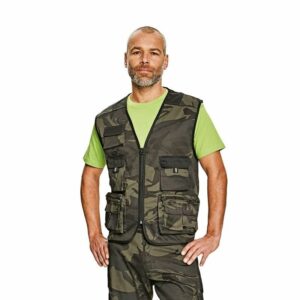 A mellény 35%-ban pamut, 65%-ban pedig poliészter anyagból készült. Kényelmes poliamid belseje van, amely a karöltőnél gumírozva van. 200 gm/m2 poliészter a bélése, álló gallérja van két patenttal. A hátrésze hosszított és a derekat védi. Nem hiába sokzsebes mellény, ugyanis az 1 belső zsebén kívül még 7 külső található rajta. Cipzáros plusz patentos záródás jellemzi.