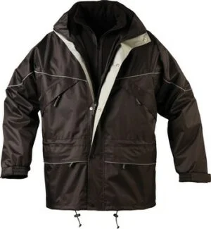 3 az 1-ben modell: kicipzározható, 280 g/m2-es, zsebes, polár belső pulóver. Erős cipzáros patentos fedővel, rejtett kapucnival és polárbetétes gallérral rendelkezik. PVC-vel vízhatlanított poliészter kulső és selymes taft belső jellemzi. Négycipzáras külső-, illetve egy belső zsebe van. Zsinórral állíthatjuk az alj- és derékbőséget. Gumis csuklópasszéja van, tépzáras állítható lehetőséggel. A kabát színe fekete, és fényvisszaverő díszcsíkok is vannak rajta.